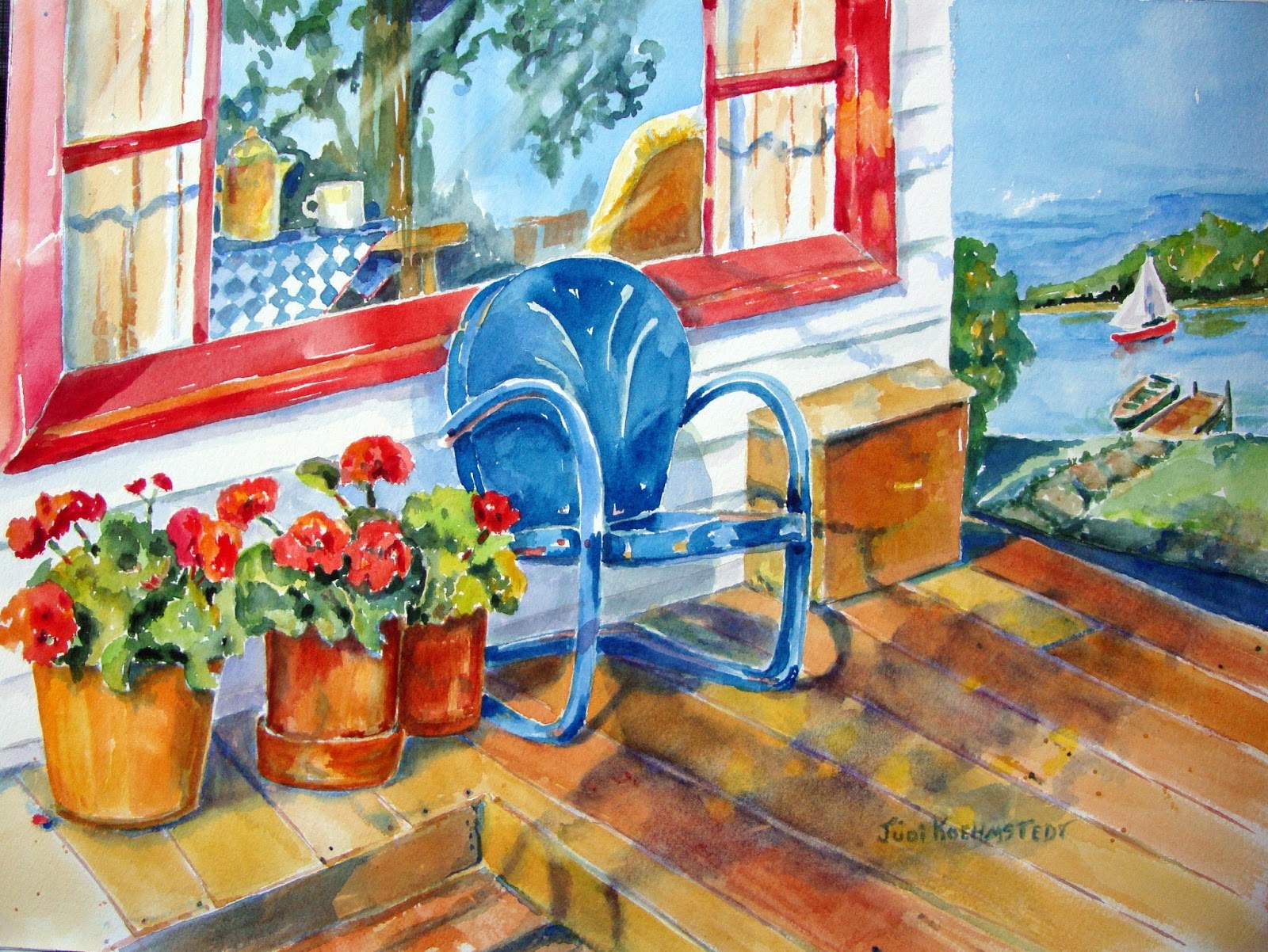 Since we just spent a few days @ "The Lake" and am getting ready for a show @ "The Lake".. i decided to paint this using a photo i took @ "The Lake" a long time ago. I so love these old metal chairs. I really stuggled painting the shadow on the boards. I don't want to talk about it...............